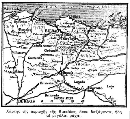 «Λονδίνον, 27 Απριλίου. Τηλεγραφήματα των Άγγλων ανταποκριτών από την Βιτόρια και το Μπιλμπάο αγγέλουν ότι η επίθεσις των επαναστατών εις το μέτωπον της Βισκάϊας συνεχίζεται επιτυχής. Αι συναπτόμεναι μάχαι είνε ίσως αι σκληρότεραι του εμφυλίου ισπανικού πολέμου.
