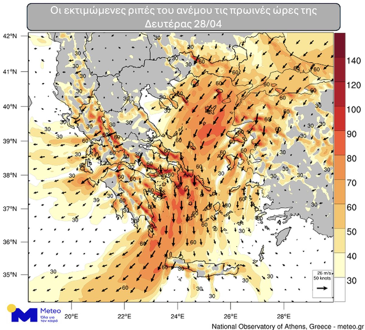 Οι ριπές του ανέμου σε τμήματα του Αιγαίου και στα ηπειρωτικά αναμένεται να ξεπεράσουν τα 70-80 km/h και τοπικά τα 90-100 km/h, όπως διακρίνεται και στην παρακάτω ομάδα χαρτών για τις πρωινές και απογευματινές ώρες της Δευτέρας 28/04.