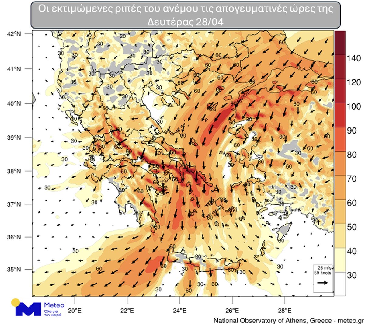 ✅Από νωρίς το πρωί της Δευτέρας οι ριπές των ανέμων σε αυτές τις περιοχές θα φτάνουν… pic.twitter.com/RbbhazIWQc— Theodoros Kolydas (@KolydasT) April 27, 2025