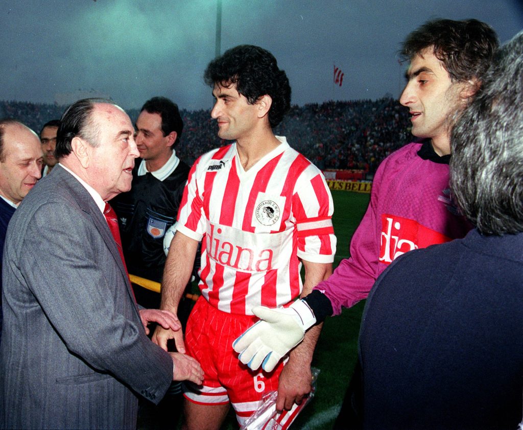 Ηταν πάντα κοντά στους παίκτες, δεν αποτελούσε «αόρατη αρχή», ήταν ένας γνήσιος Ολυμπιακός. Εδώ με τους Τσαλουχίδη και Ταληκριάδη το 1992 – έναν χρόνο πριν παραδώσει τις τύχες της ομάδας στον Σωκράτη Κόκκαλη