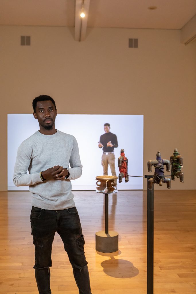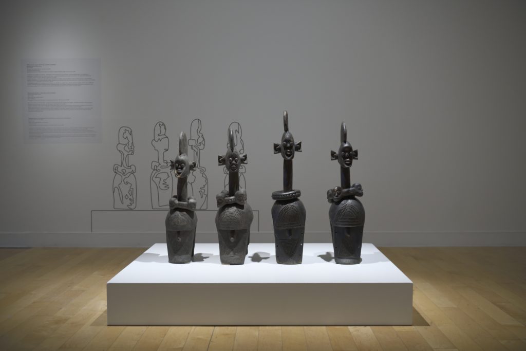 Θα τον δείτε να καταθέτει τη δική του μαρτυρία στο βίντεο που προβάλλεται στο τμήμα των αντικειμένων της συλλογής. Ανάμεσά τους και οι κούκλες γονιμότητας του πολιτισμού των Namji /Dowayo από το Βορειοδυτικό Καμερούν, που χρονολογούνται στον 20ο αιώνα (Άγνωστου Κατασκευαστή, οι κούκλες είναι πιθανόν να είναι made for market, να έχουν παραχθεί κατευθείαν για την αγορά) και φαίνονται στη φωτογραφία του Μούσα Σάνγκαρε.