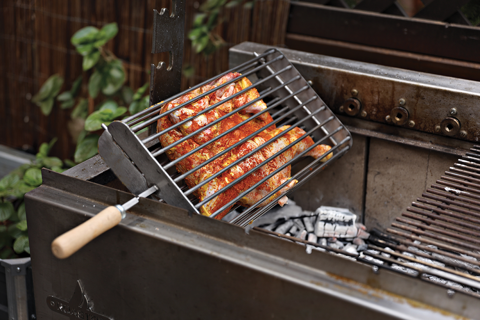 Ο σεφ επιμένει ότι η σχάρα θέλει χρόνο. «Στους 120 βαθμούς στο φούρνο, ένα κοτόπουλο μπορεί να ψηθεί σε μία ώρα. Αν το αφήσετε να σιγοψηθεί για τέσσερις ώρες στους ίδιους βαθμούς στη σχάρα, θα είναι απίστευτα ζουμερό και θα ξεκολλά από το κόκαλο. Μπορείτε στο τέλος να αλείψετε με ένα πινελάκι λίγη μελάσα ή μέλι με σόγια. Έτσι, τα σάκχαρα θα σχηματίσουν μια νόστιμη κρούστα στην επιφάνειά του, ενώ το κρέας από μέσα θα είναι ζουμερό».