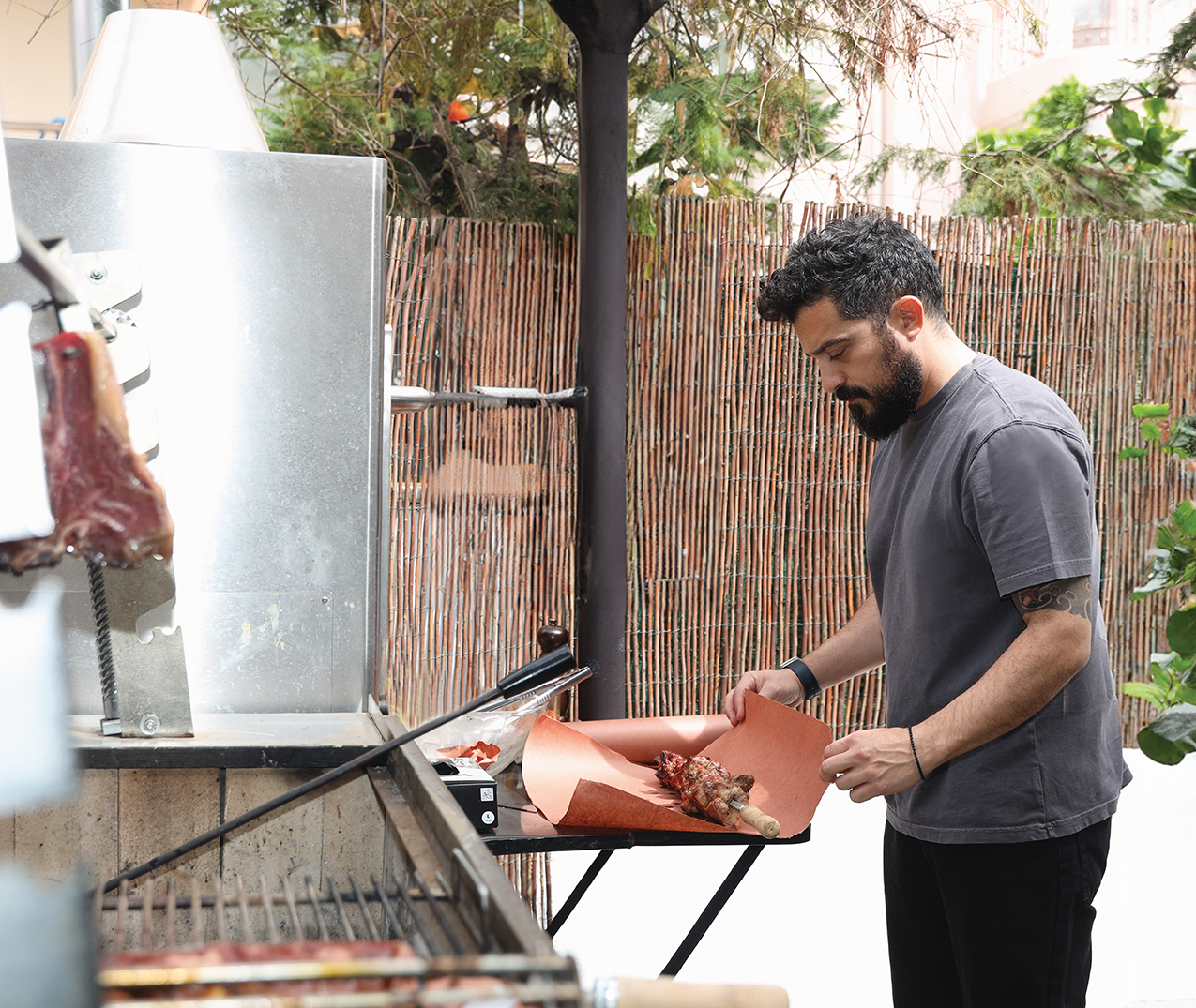 Το hanger steak που είχε αφήσει να σιγομαγειρεύεται πάνω από τη φωτιά είναι έτοιμο. «Το μυστικό για το καραμέλωμα είναι να ξεκινήσετε με δυνατή φωτιά. Αν πάρετε δύο μπριζόλες και ψήσετε τη μία σε δυνατή και την άλλη σε χαμηλή φωτιά, θα διαπιστώσετε ότι στο τέλος αυτή που μαγειρεύτηκε στη χαμηλή είναι πιο βαριά, αλλά σε γεύση υστερεί πολύ. Το καραμέλωμα γίνεται από τις πρωτεΐνες, οι οποίες δημιουργούν μια ωραία κρούστα όταν θερμαίνονται», μας συμβουλεύει.