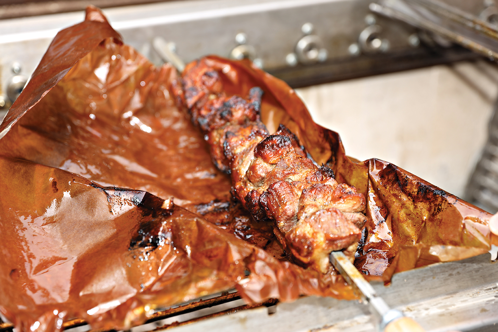 Ο Βασίλης Σπόρος βγάζει από τη φωτιά το κοντοσούβλι, το οποίο έχει καραμελώσει, και το τυλίγει σε ένα ειδικό αλουμινόχαρτο που έχει παραγγείλει από την Αμερική. «Όταν τυλίγουμε το κοντοσούβλι σε αλουμινόχαρτο, η θερμοκρασία διατηρείται στο εσωτερικό του και γίνεται πιο μαλακό. Η σούβλα γενικότερα κρατά περισσότερο την υγρασία του κρέατος. Το σημαντικότερο είναι να ξεκινήσετε να ψήνετε τα κοντοσούβλια σε δυνατή φωτιά για να καραμελώσουν. Το χοιρινό, προτού το κάνω κοντοσούβλι, το αφήνω για 24 ώρες σε μια άρμη με νερό, ζάχαρη και αλάτι. Αυτή η μαρινάδα δίνει γεύση».