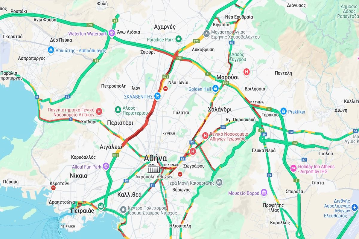 Η κατάσταση είναι πολύ δύσκολη προς το αεροδρόμιο, από τη Φυλής έως την Κηφισίας και από Μεταμόρφωση έως την Κηφισίας. Πολύ αυξημένη είναι η κίνηση και προς την Ελευσίνα, από Πλακεντίας έως Κηφισίας, στην έξοδο για Λαμία και από Αγία Παρασκευή έως Κηφισίας.