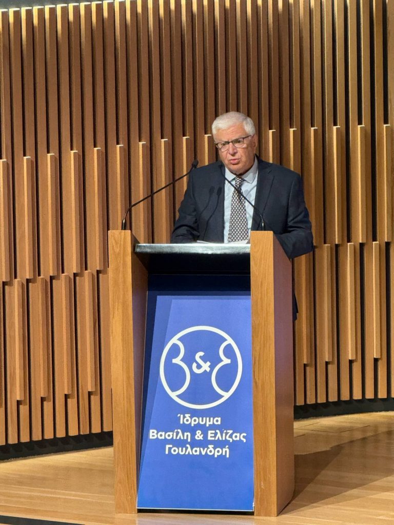 «Είμαι ευγνώμων για την πολύτιμη συγκυρία που μου παρέχει την ευκαιρία να αρθρώσω λίγα λόγια ευχαριστιών προς την Παναγιότητά σας που παρά το βεβαρημένο πρόγραμμά σας δεχθήκατε ευμενώς την πρόσκλησή μας και είστε μαζί μας εδώ σήμερα για να δεηθείτε υπέρ της ευόδωσης των σκοπών αυτού του κέντρου τέχνης και πολιτισμού που ο αείμνηστος Βασίλης Γουλανδρής με την σύζυγό του Ελίζα, [άρχοντες στην γενναιοδωρία και αρχοντικοί στην καθημερινότητά τους], χρηματοδότησαν και γενναιόδωρα εμπλούτισαν με σημαντικότατα, εμβληματικά θα έλεγα, έργα τέχνης», ανέφερε ο κ. Κουτσομάλλης ανοίγοντας τις ομιλίες μετά από την προβολή μέσα σε κατάνυξη πεντάλεπτου συγκινητικού βίντεο για τη ζωή και το έργο του Πατριάρχη.