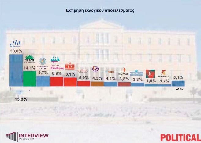 Το προβάδισμα της ΝΔ είναι στο 15,9% έναντι του ΠαΣοΚ. Ο Κυριάκος Μητσοτάκης παραμένει καταλληλότερος πρωθυπουργός, όμως οι πολίτες θέτουν ως πρώτο θέμα στην ατζέντα την ακρίβεια. Η ΝΔ στο 30% -Χαμηλά δεύτερο το ΠΑΣΟΚ, στην 4η θέση έπεσε η Ζωή Κωνσταντοπούλου.