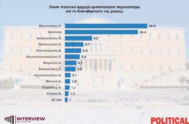 Στο ερώτημα «Ποιον πολιτικό αρχηγό εμπιστεύεστε περισσότερο για τη διακυβέρνηση της χώρας» ο Κυριάκος Μητσοτάκης εξακολουθεί να παραμένει η πρώτη επιλογή των πολιτών. Ο πρωθυπουργός συγκεντρώνει το 29,8% των απαντήσεων και ακολουθούν: ο «κανένας» με 26,4%, ο Νίκος Ανδρουλάκης με 9,8%, ο Κυριάκος Βελόπουλος με 6,7%, ο Δημήτρης Κουτσούμπας με 5,9%, η Ζωή Κωνσταντοπούλου 5,4%, ο Σωκράτης Φάμελλος με 4,1%, ο Στέφανος Κασσελάκης με 3,9%, η Αφροδίτη Λατινοπούλου με 2,1%, ο Δημήτρης Νατσιός με 1,9%, ο Αλέξης Χαρίτσης με 1,7%, ο Βασίλης Στίγκας με 1,3%, ενώ «δεν γνωρίζω / δεν απαντώ» λέει το 1%.