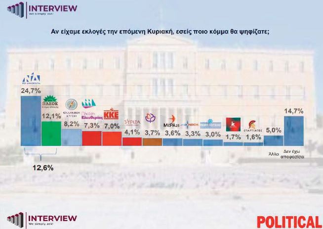 Στο ερώτημα «Αν είχαμε εκλογές την επόμενη Κυριακή, εσείς ποιο κόμμα θα ψηφίζατε», οι ερωτηθέντες σε ποσοστό 24,7% επιλέγουν τη Νέα Δημοκρατία, το 12,1% το ΠΑΣΟΚ, 8,2% την Ελληνική Λύση, 7,3% την Πλεύση Ελευθερίας, το 7% το ΚΚΕ, το 4,1% τον ΣΥΡΙΖΑ, το 3,7% το Κίνημα Δημοκρατίας, το 3,6% το ΜέΡΑ25, τη Νίκη το 3,3%, τη Φωνή Λογικής το 3%, τη Νέα Αριστερά το 1,7%, τους Σπαρτιάτες το 1,6%, «άλλο» το 5%, ενώ το 14,7% δεν έχει αποφασίσει.