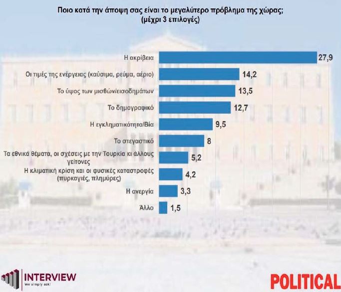 Σύμφωνα με την ίδια δημοσκόπηση, οι πολίτες αναδεικνύουν την ακρίβεια ως το σημαντικότερο πρόβλημα της χώρας, με το 27,9% να την κατατάσσει πρώτη. Επιπλέον, το 19,5% των ερωτηθέντων δηλώνει ότι τα οικονομικά της οικογένειάς τους αποτελούν το βασικό κριτήριο για την ψήφο τους.