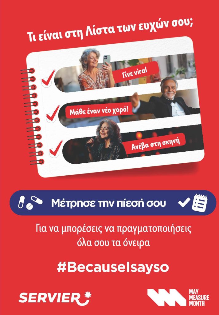 Με στόχο να ευαισθητοποιήσει και να ενημερώσει το ευρύ κοινό για την καίρια σημασία της έγκαιρης διάγνωσης της υπέρτασης μέσω του τακτικού ελέγχου της αρτηριακής πίεσης και με αφορμή τη 17η Μαΐου, η οποία έχει ορισθεί ως Παγκόσμια Ημέρα Υπέρτασης, η Servier Hellas στηρίζει για ακόμη μία χρονιά την εκστρατεία #BecauseIsayso του Ομίλου Servier.