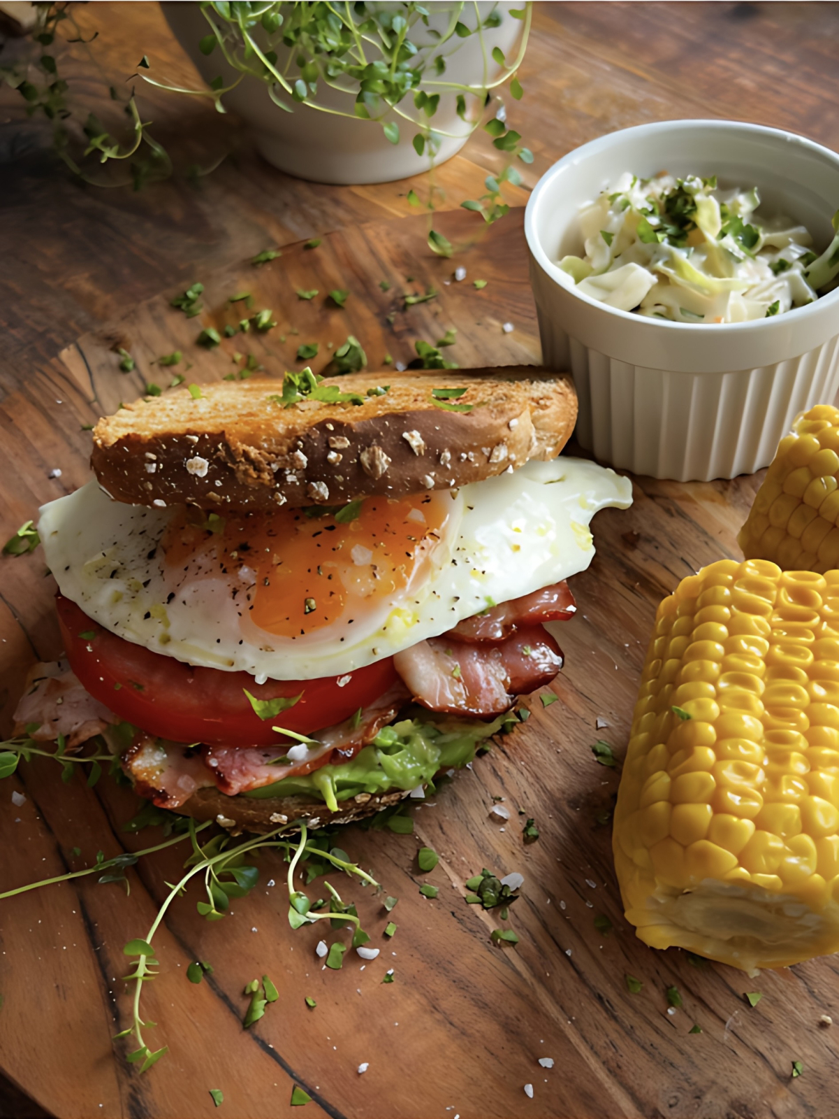 Σάντουιτς με μπέικον, αβγό, ντομάτα και μαγιονέζα σε πολύσπορο ψωμί