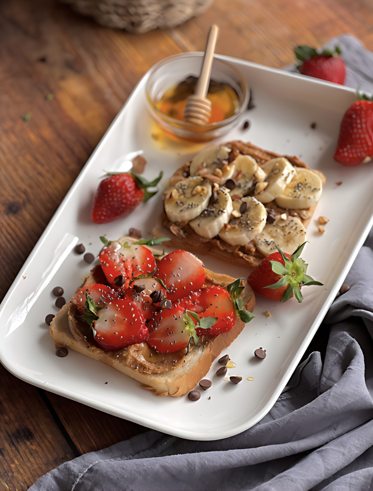 Open sandwich με φιστικοβούτυρο, μπανάνα, μέλι, chia και αμύγδαλα