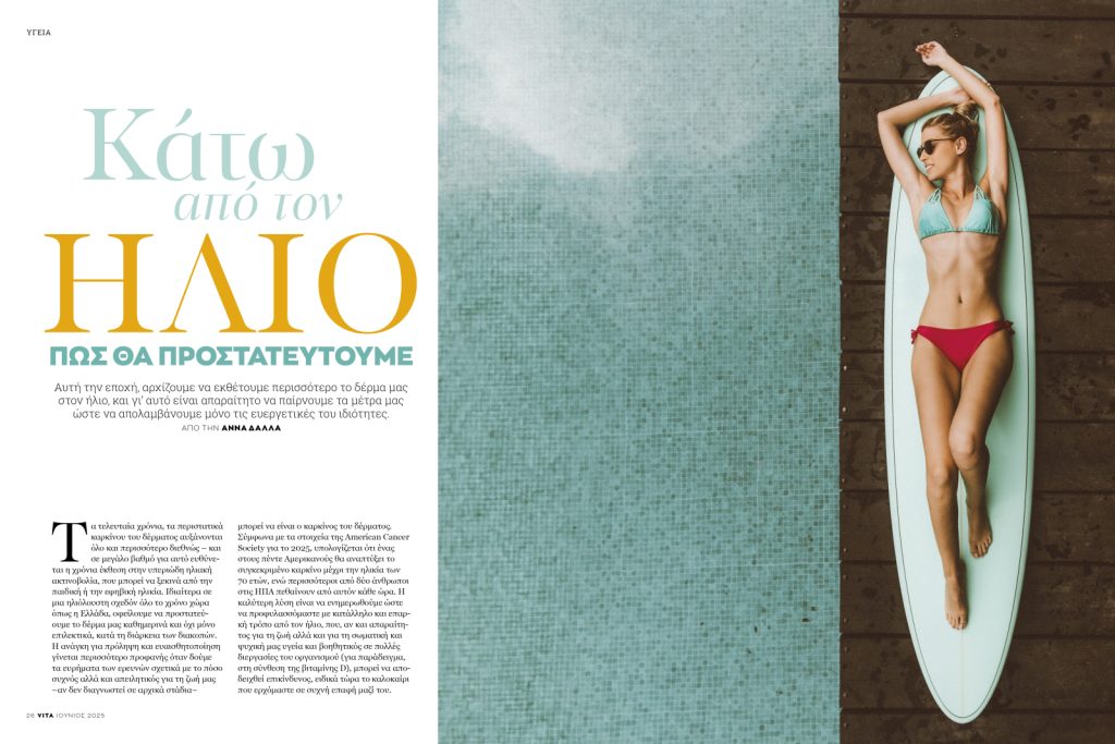 Στο νέο τεύχος του VITA, του μεγαλύτερου ελληνικού περιοδικού για την υγεία και την ευεξία, που κυκλοφορεί αποκλειστικά με ΤΟ ΒΗΜΑ αυτή την Κυριακή 25 Μαϊου, στο μικροσκόπιο μπαίνει ο ήλιος και η προστασία μας από αυτόν. Τα νέα περιστατικά καρκίνου του δέρματος συνεχώς αυξάνονται διεθνώς και σε μεγάλο βαθμό για αυτό ευθύνεται και η χρόνια έκθεση στην υπεριώδη του ακτινοβολία από την παιδική και εφηβική μας ηλικία.