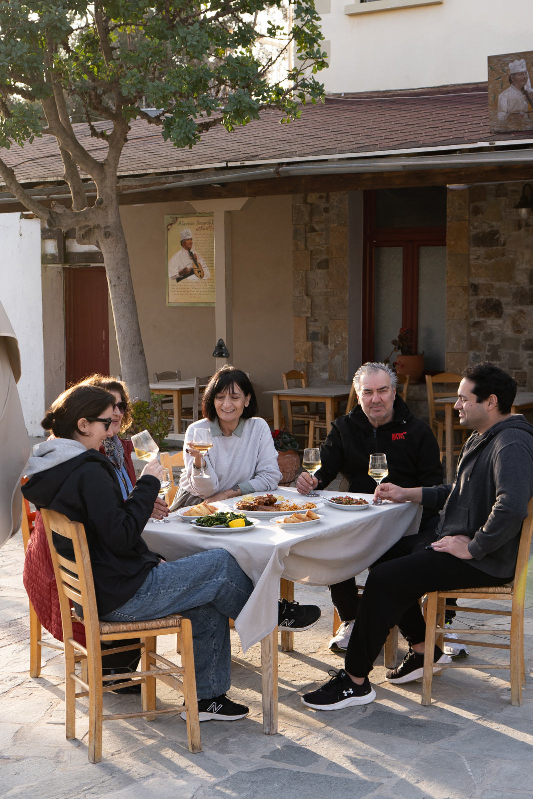 Οι σούβλες παίρνουν φωτιά από τις 7 το απόγευμα και η μικρή πλατεία μπροστά από τα μαγαζιά γεμίζει από κόσμο που δεν χορταίνει την κουζίνα τους. Εμείς, απολαύσαμε ένα εξαιρετικό γεύμα με κόκορα και παραδοσιακά φλωμάρια, φτιαγμένο με μεράκι από τη μαγείρισσα Μαρία Πεττή.