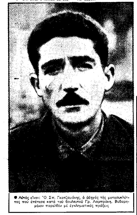 »Αι αστυνομικαί Αρχαί διεξάγουν ανακρίσεις διά την ανακάλυψιν του οδηγού του τρικύκλου, ως και διά την ανεύρεσιν των πρωταιτίων των επεισοδίων. Αργά την νύκτα συνελήφθη ο οδηγός του τρικύκλου, ονόματι Σπυρ. Γκοτζαμάνης, ετών 35, μεταφορεύς, ο οποίος ισχυρίσθη ότι τυχαίως επέπεσεν επί του βουλευτού Λαμπράκη, τον οποίον και δεν εγνώριζε.