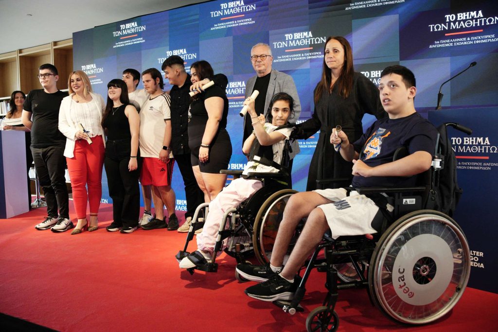 Ιδιαίτερη στιγμή της εκδήλωσης ήταν η απονομή των βραβείων για τις σχολικές εφημερίδες που έφτιαξαν οι μαθήτριες και οι μαθητές των Ειδικών Σχολείων Αθήνας, Πειραιά και Θεσσαλονίκης από τον Γενικό Διευθυντή Ειδήσεων και Ενημέρωσης του MEGA, κ. Σταμάτη Μαλέλη καθώς και του σχολείου των Φιλιππίνων για την αγγλόφωνη δική τους εφημερίδα.