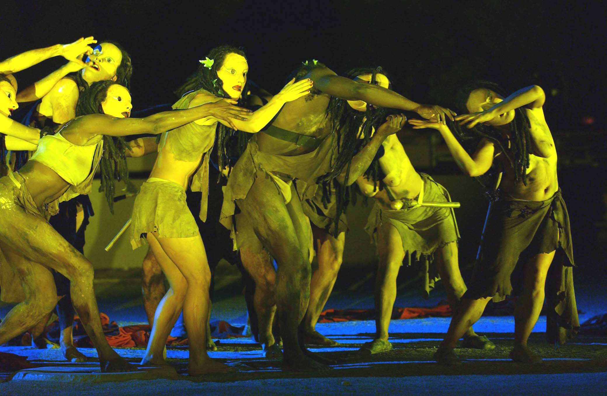Δέκα ώρες κρατούσε η παράσταση που αποτελούνταν από 15μελή ανδρικό θίασο, με τους ηθοποιούς να φορούν μάσκες. κατά τη συνήθεια του σκηνοθέτη.