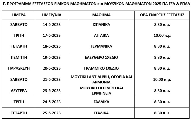 Οι Πανελλήνιες θα ολοκληρωθούν για τα ΓΕΛ στις 6/6 και για τα ΕΠΑΛ 16/6 και θα ακολουθήσουν τα Ειδικά Μαθήματα από τις 14 Ιουνίου. Η εξέταση των Ειδικών Μαθημάτων ξεκινάει με τα Ισπανικά και τελειώνει την Παρασκευή 25 Ιουνίου με το μάθημα των Ιταλικών.