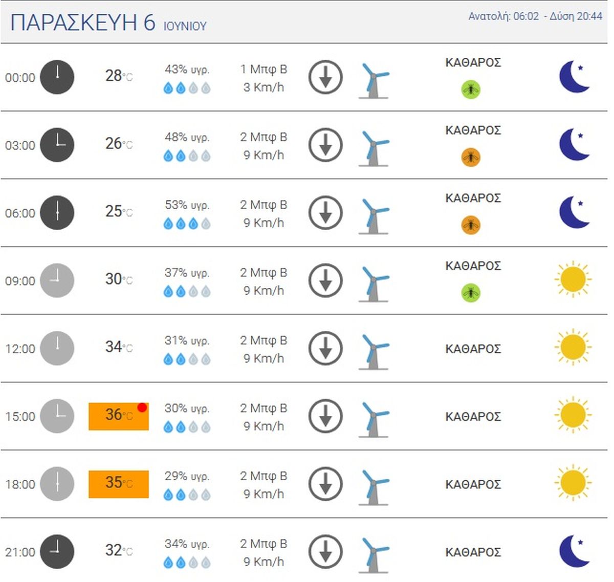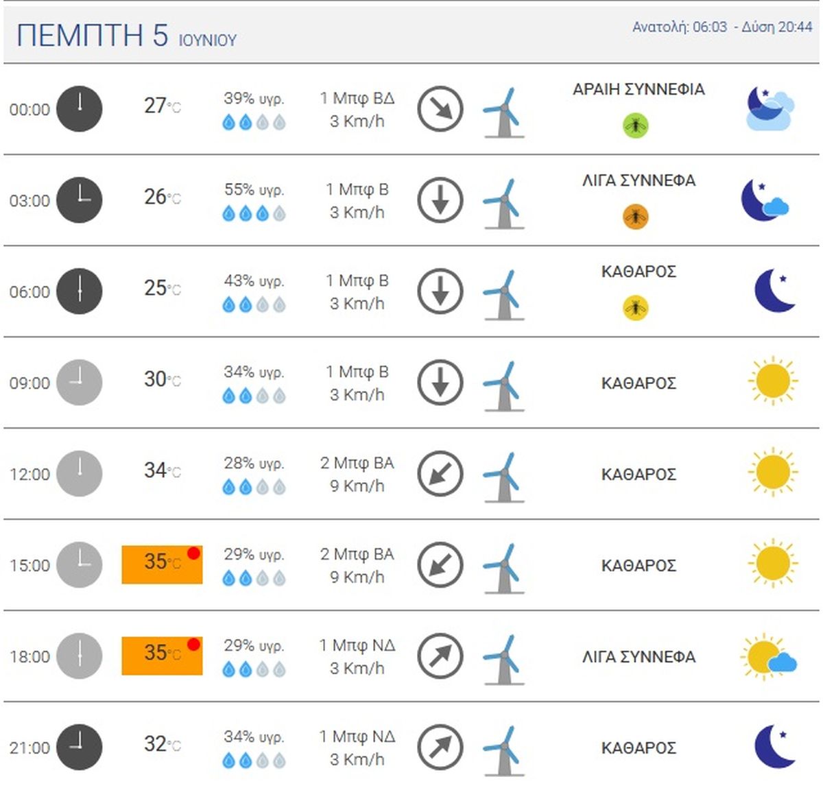 Θερμοκρασία: Από 15 έως 27 βαθμούς Κελσίου. Στη δυτική Μακεδονία 2 με 3 βαθμούς χαμηλότερη.