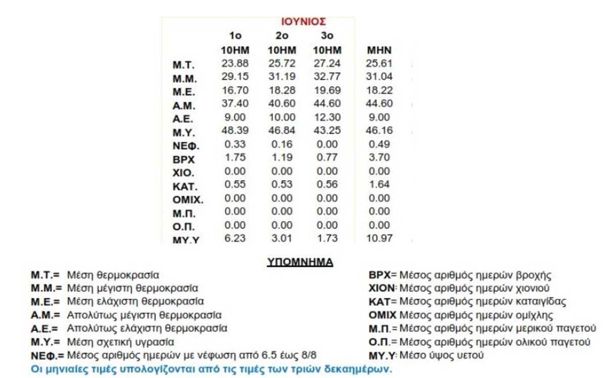 Σύμφωνα με τον Θοδωρή Κολυδά για το πρώτο δεκαήμερο του Ιουνίου η μέση μέγιστη τιμή της θερμοκρασίας είναι οι 29,15 βαθμοί, για το δεύτερο δεκαήμερο οι 31,19 και για το τρίτο οι 32,77 βαθμοί Κελσίου.