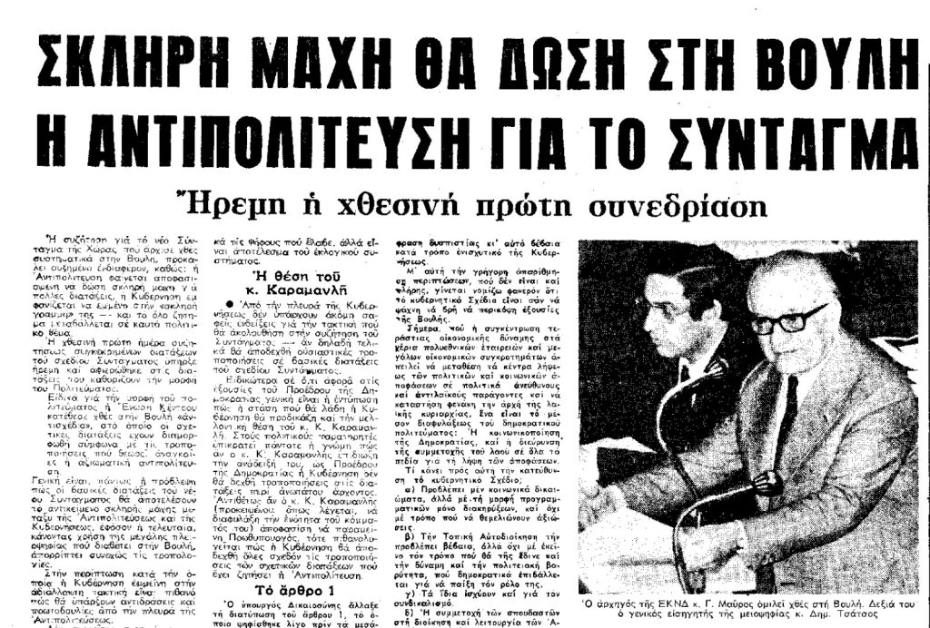 12. Το αρχικό σχέδιο του Συντάγματος, το οποίο κατατέθηκε προς συζήτηση στη Βουλή στις 24 Δεκεμβρίου 1974, προκάλεσε πλήθος αντιδράσεων από τα κόμματα της αντιπολίτευσης για σειρά διατάξεων