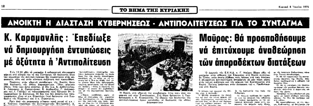 41. «Οι κανόνες που περιέχει ένα Σύνταγμα ή οι πράξεις που επιχειρούνται με βάση το Σύνταγμα, έχουν τότε μόνο ισχύ και δεσμεύουν όταν εκφράζουν το νόημα μιας συγκεκριμένα διατυπωμένης λαϊκής βουλήσεως. Γι’ αυτό αυτοί που θα εφαρμόσουν ή θα ερμηνεύσουν το νέο Σύνταγμα είναι δεσμευμένοι από την λαϊκή ετυμηγορία της 8ης Δεκεμβρίου 1974». Απόσπασμα του κεντρικού άρθρου του «ΒΗΜΑΤΟΣ» στις 8 Ιουνίου 1975.
