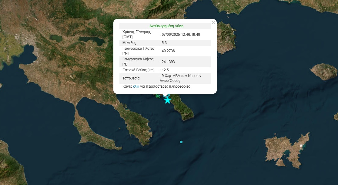 Σεισμός μεγέθους 5,3 Ρίχτερ σημειώθηκε στη Χαλκιδική και συγκεκριμένα στο Άγιο Όρο, το μεσημέρι του Σαββάτου.