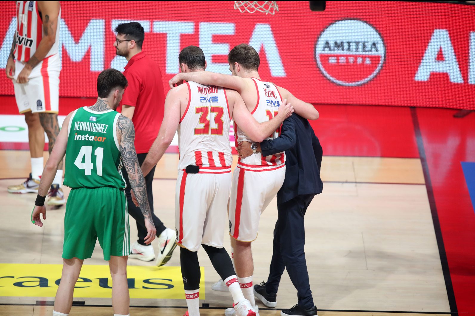 Ανησυχία στον Ολυμπιακό, με τον Σάσα Βεζένκοφ να τραυματίζεται στον αστράγαλο κατά τη διάρκεια του τέταρτου τελικού με τον Παναθηναϊκό και να αποχωρεί υποβασταζόμενος.