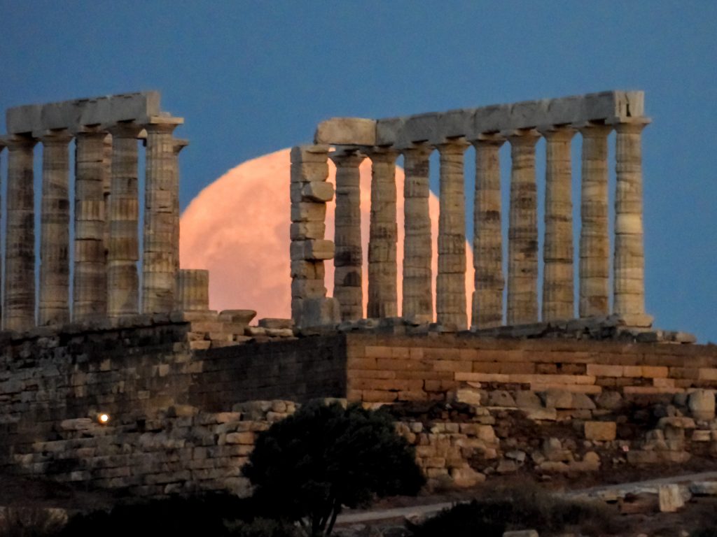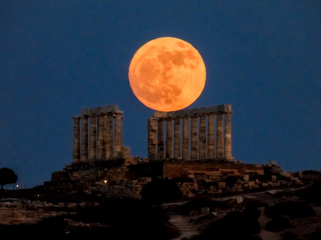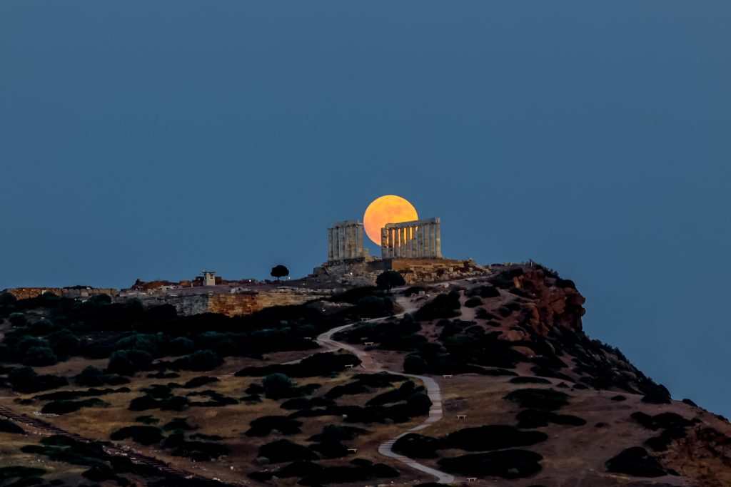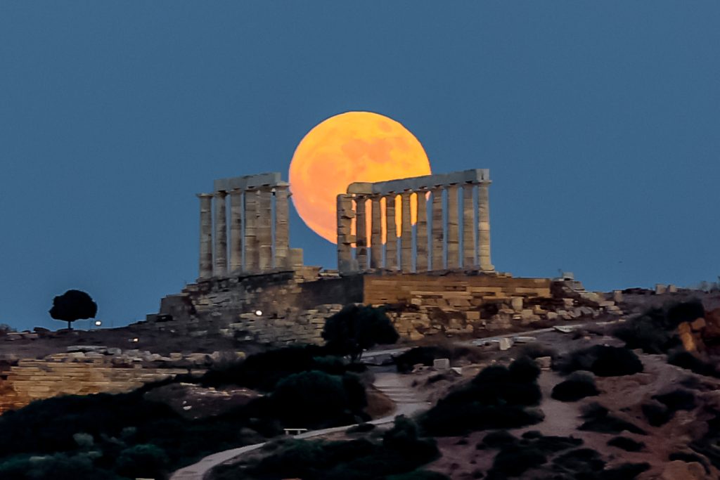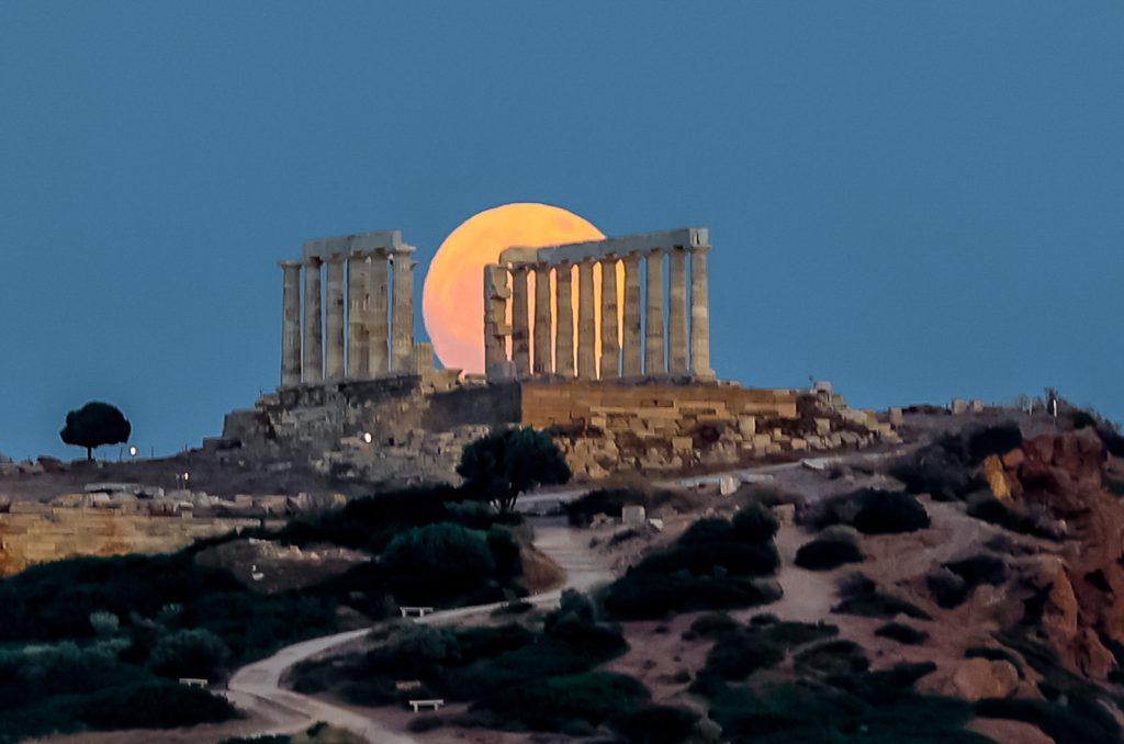 Την ασύλληπτης ομορφιάς εικόνα την παραμονή της πανσελήνου του Ιουνίου παγίδεψε με τον φακό του ο Γιώργος Κονταρίνης από την Eurokinissi, με φόντο τον ναό του Ποσειδώνα, στο Σούνιο.