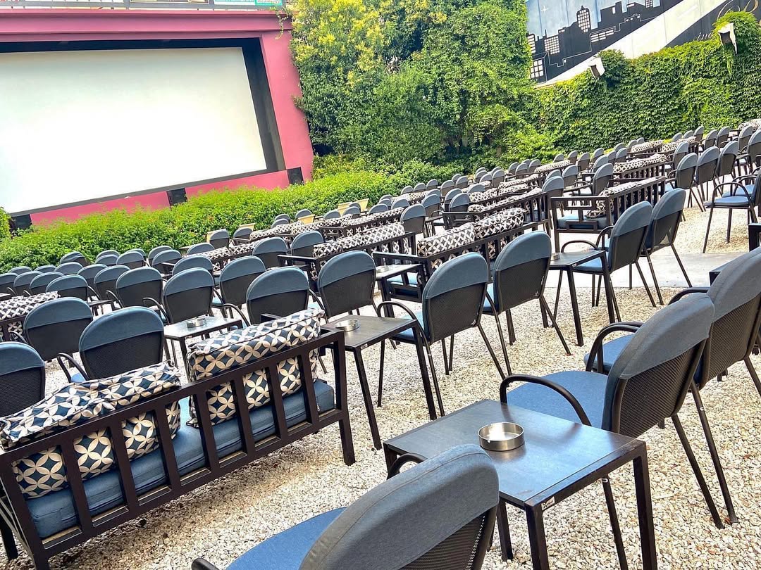 Κάτω από την οθόνη, που μοιάζει με προαύλιο νεοκλασικού, τα τραπεζάκια και οι χαρακτηριστικές μπορντό καρέκλες σε προσκαλούν για χαλάρωση. Αν αγαπάτε τα λίγο πικάντικα, στην καντίνα θα βρείτε σπιτική πίτσα μαργαρίτα ή πεπερόνι. Τα exclusive cocktails ξεχωρίζουν: House Spritz με Aperol και ροδάκινο, Frozen Mango Colada με ρούμι και ανανά, Paloma με λευκή τεκίλα και λάιμ ή το μοναδικό Tropical Brain Freeze με βότκα και φρούτα του πάθους. Για εκείνους, πάλι, που προτιμούν τις alcohol-free επιλογές, η λεμονάδα με αγαύη και πιπερόριζα είναι το τέλειο υποκατάστατο. Όλα αυτά τα ωραία σερβιρισμένα με εικόνα τελευταίας τεχνολογίας και ήχο state-of-the-art.