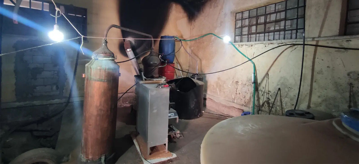 Συνολικά, από τις έρευνες που πραγματοποιήθηκαν στην οικία του και στις εγκαταστάσεις του παράνομου αποστακτηρίου, βρέθηκαν και κατασχέθηκαν πλήρως εξοπλισμένο σύστημα απόσταξης, 4.055 λίτρα παρανόμως παραγόμενου αλκοολούχου πότου, πιστόλι με γεμιστήρα που περιείχε 12 φυσίγγια των 9mm, αυτοσχέδιος εκρηκτικός μηχανισμός, σπαθί τύπου «Κατάνα» (μήκος λάμας 63,5 εκ.), περονοφόρο ανυψωτικό μηχάνημα (κλαρκ) και φορτηγό αυτοκίνητο.