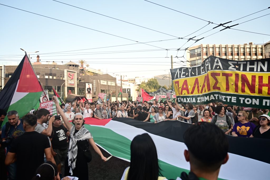 «Η ιστορία έχει μια σωστή πλευρά, με την Παλαιστίνη ως τη λευτεριά», ήταν ένα από τα κυρίαρχα συνθήματα της διαδήλωσης που ξεκίνησε από τη στάση του Μετρό «Πανόρμου» και κατευθύνθηκε προς την Ισραηλινή Πρεσβεία.