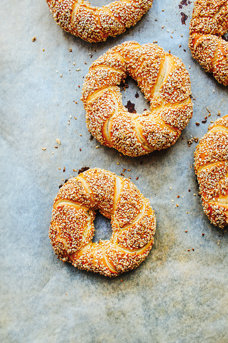 Ενώ το κλασικό ελληνικό κουλούρι είναι ένα λεπτό δαχτυλίδι ψωμιού επικαλυμμένο με σουσάμι, αυτό που εγώ προτιμώ να φτιάχνω και να τρώω είναι το πολίτικο σιμίτι – λογικό με μητέρα Πολίτισσα. Προέρχεται από τους Έλληνες φουρναραίους της Κωνσταντινούπολης και είναι πλεχτό σαν κοτσίδα και στρουμπουλό, το οποίο πρώτα βουτάμε σε πετιμέζι που του χαρίζει μια ανεπαίσθητη γλύκα και έπειτα το ντύνουμε με καβουρντισμένο σουσάμι προτού ψηθεί. Το αποτέλεσμα είναι ένα κουλούρι υπέροχα τραγανό απέξω, αλλά αφράτο και μαλακό εσωτερικά, με μια ελαφρώς μαστιχωτή υφή.