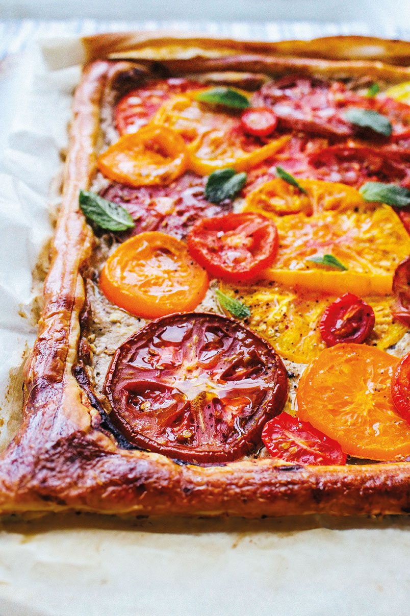 Τάρτα σφολιάτας με ντομάτες, φέτα & μαύρο σκόρδο