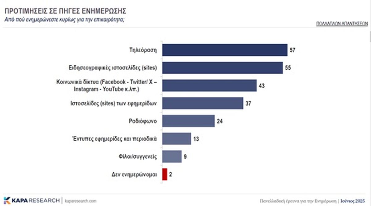 Το 57% δηλώνει ότι ενημερώνεται από την τηλεόραση, το 55% από τις ειδησεογραφικές ιστοσελίδες, το 43% από τα Μέσα Κοινωνικής Δικτύωσης, ενώ μόλις 37% από τις ιστοσελίδες εφημερίδων, 25% από το ραδιόφωνο, 13% από τις έντυπες εκδόσεις των εφημερίδων και περιοδικά, 9% από φίλους και συγγενείς και 2% δηλώνει ότι δεν ενημερώνεται.