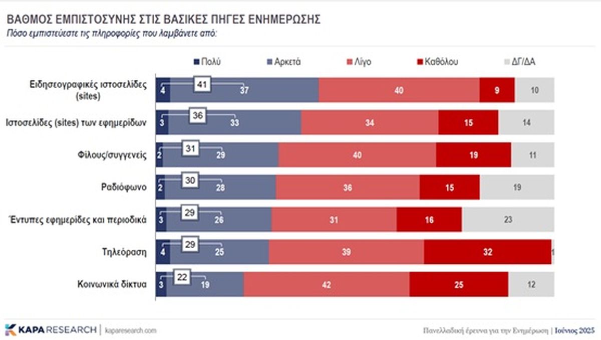 Εμπιστεύονται πολύ και αρκετά (41%) τις ειδησεογραφικές ιστοσελίδες, (36%) τις ιστοσελίδες των εφημερίδων, (31%) τους φίλους και συγγενείς, (30%) το ραδιόφωνο, (29%) τις έντυπες εφημερίδες και περιοδικά, (29%) την τηλεόραση και μόλις (22%) τα Μέσα Κοινωνικής Δικτύωσης.