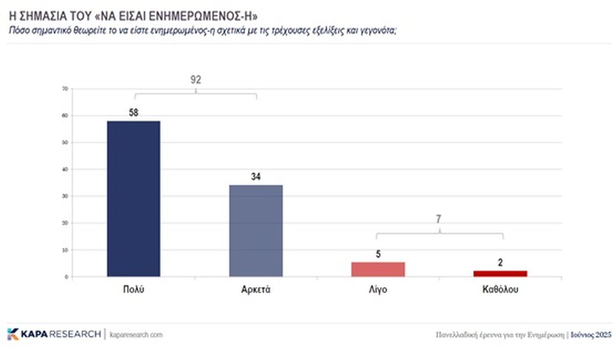 Περισσότεροι από 9 στους δέκα (92%) θεωρούν ότι είναι πολύ και αρκετά σημαντικό να είναι ενημερωμένοι, με μόλις 7% να πιστεύουν ότι είναι λίγο και καθόλου σημαντικό.