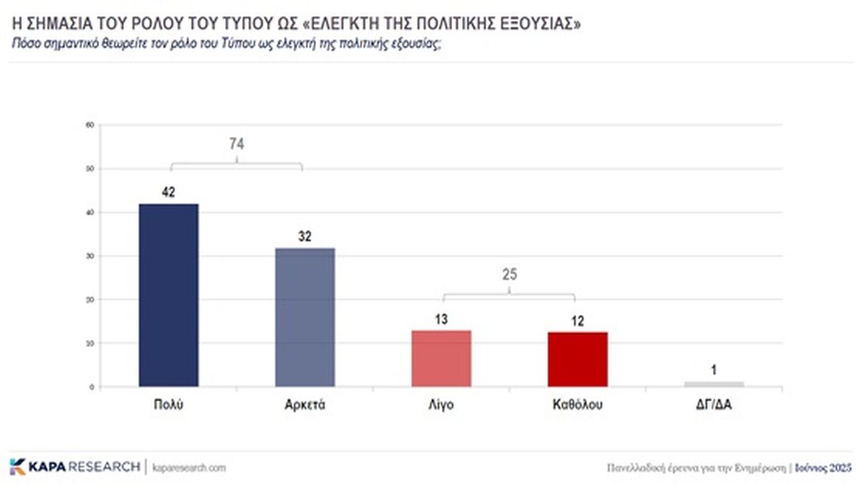 Ταυτόχρονα περισσότεροι από 7 στους δέκα (74%) θεωρούν ως πολύ σημαντικό και αρκετά σημαντικό τον ρόλο του Τύπου ως ελεγκτή της εξουσίας.