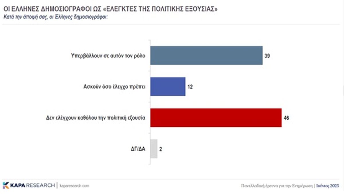 Ωστόσο οι πολίτες είναι διχασμένοι για τον τρόπο που οι δημοσιογράφοι ασκούν το ρόλο τους ως ελεγκτές της εξουσίας με σχεδόν τους μισούς (46%) να θεωρούν ότι οι Έλληνες δημοσιογράφοι δεν ελέγχουν καθόλου την πολιτική εξουσία και ταυτόχρονα ένα σημαντικό ποσοστό (39%) να θεωρεί ότι υπερβάλλουν στον ρόλο τους ως ελεγκτές.