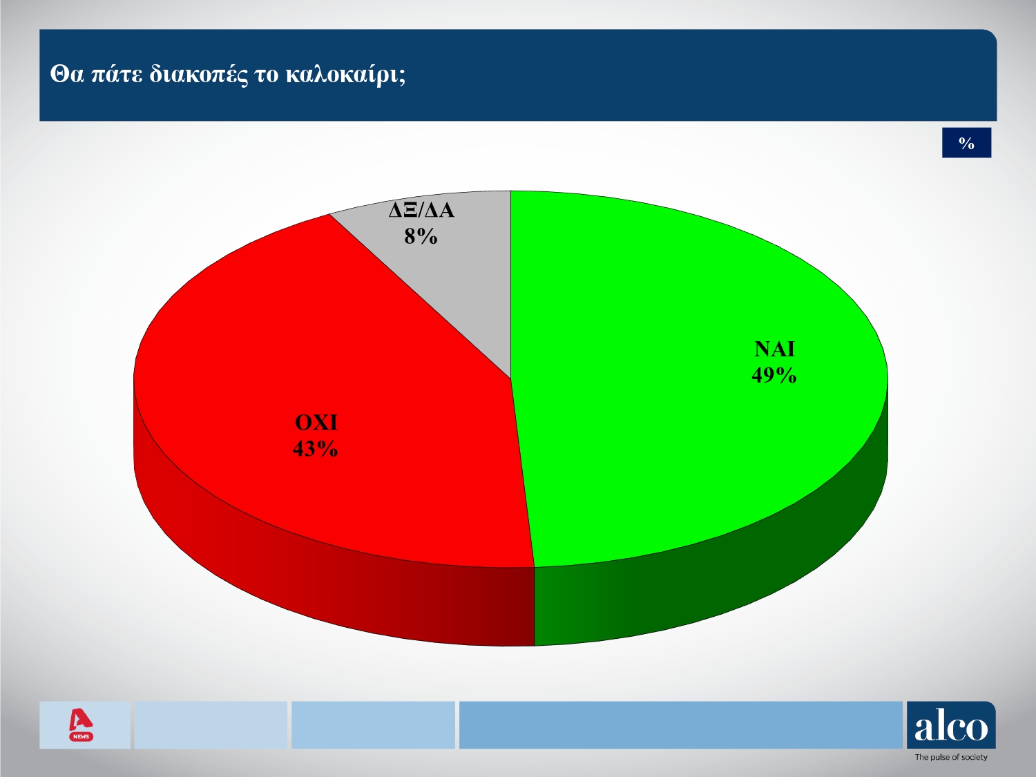 Σχεδόν ένας στους δύο δήλωσε πως είτε δεν θα πάει διακοπές είτε δε γνωρίζει αν θα το πράξει, ενώ το 49% δήλωσε πως θα το κάνει. Η πλειοψηφία των ερωτηθέντων επεσήμανε ότι θα πάει σε κάποιο δικό του σπίτι ή σε συγγενικό για να περάσει τις ημέρες των διακοπών.