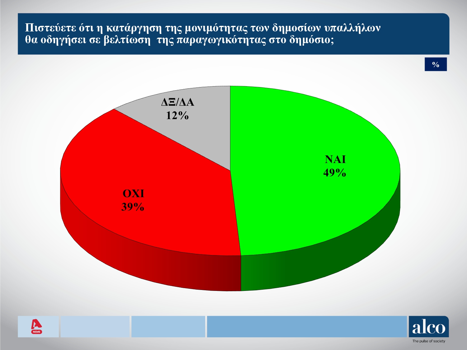 Την ίδια ώρα σε ένα άλλο ερώτημα που απασχολεί την επικαιρότητα είναι η συζήτηση για την κατάργηση της μονιμότητας στο δημόσιο. Περίπου ένας στους δύο πιστεύει ότι αυτό το μέτρο θα αυξήσει την παραγωγικότητα των υπαλλήλων.