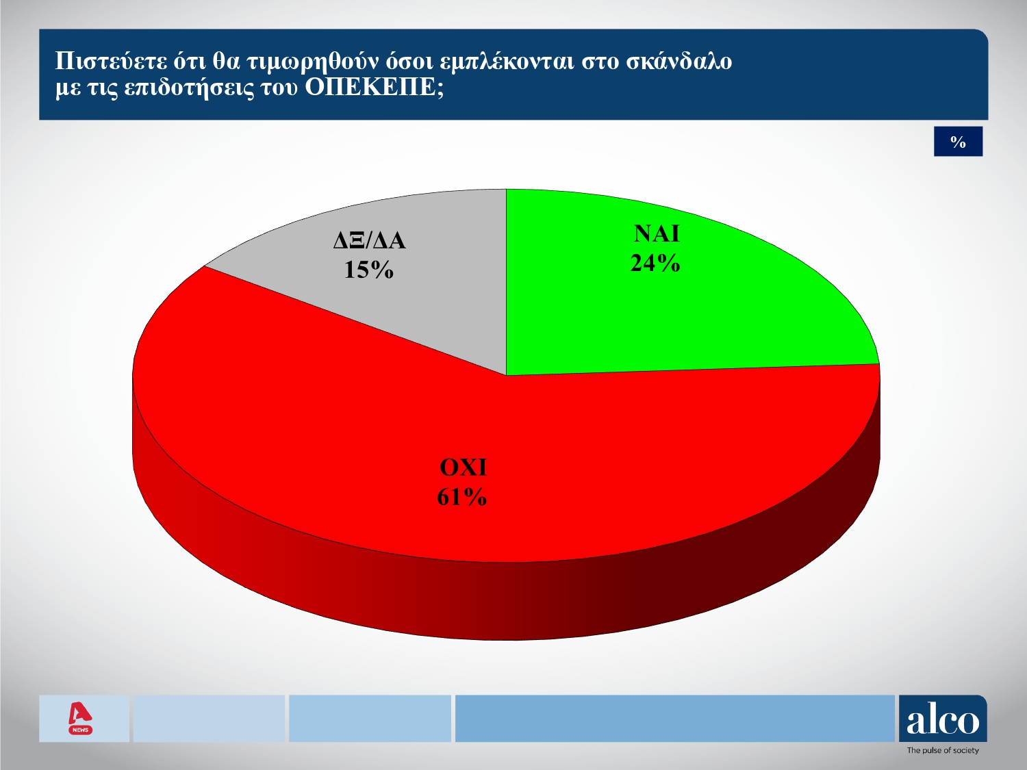 Την ίδια ώρα υπάρχει σιγουριά ότι δε θα υπάρξει τιμωρία για το σκάνδαλο του ΟΠΕΚΕΠΕ. Το 61% θεωρεί ότι δεν θα υπάρξει τιμωρία όσων εμπλέκονται και μόλις το 24% πιστεύει ότι οι ένοχοι θα οδηγηθούν στη φυλακή.