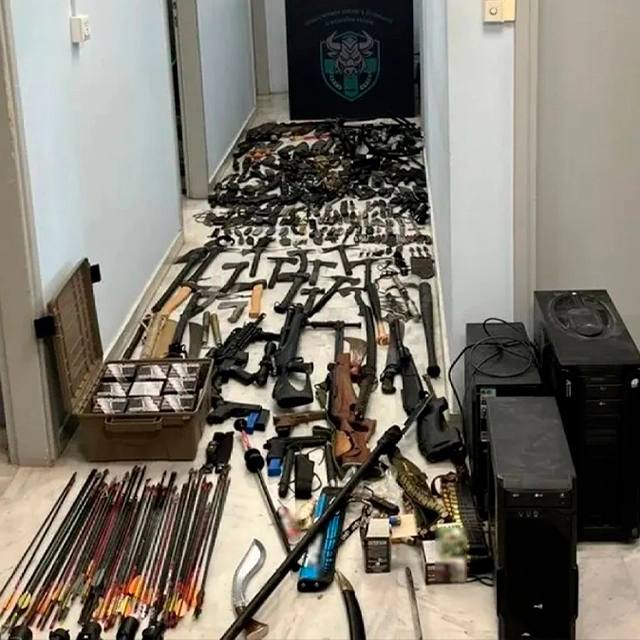 Μεταξύ άλλων βρέθηκαν και κατασχέθηκαν: σπαθιά, 107 τσεκούρια, 177 μαχαίρια, 4 αεροβόλα όπλα, 3 αεροβόλα πιστόλια, τόξα, 3 βαλλίστρες, 51 βέλη, 6 διόπτρες, ρόπαλα, σφεντόνες, σιδερένια γκλοπ, γεμιστήρες και πλήθος φυσιγγίων.