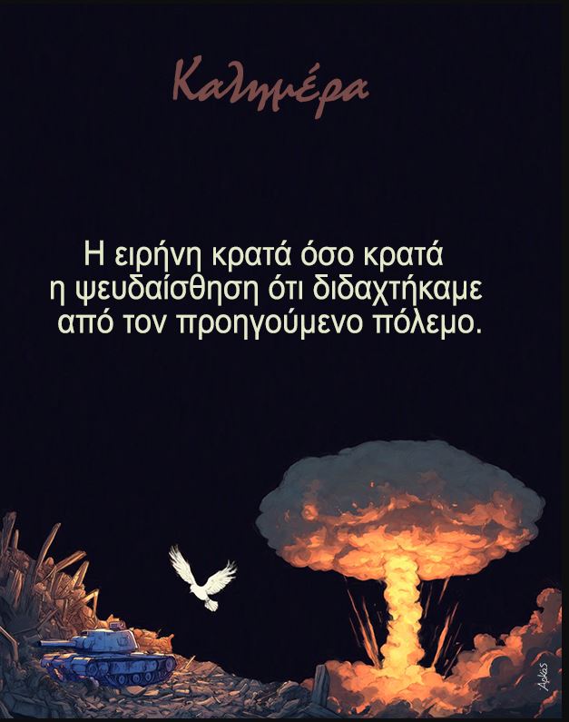 Στο βαρύ κλίμα του πολέμου μεταξύ Ισραήλ – Ιράν ο Αρκάς. Ο διάσημος σκιτσογράφος μάς καλημερίζει με ένα σκίτσο σε μαύρο φόντο, όπου διακρίνονται στη δεξιά του πλευρά το πύρινο μανιτάρι μιας πυρηνικής έκρηξης, στην αριστερή του ένα τανκ και στη μέση, πάνω στο μαύρο φόντο, ένα λευκό περιστέρι.