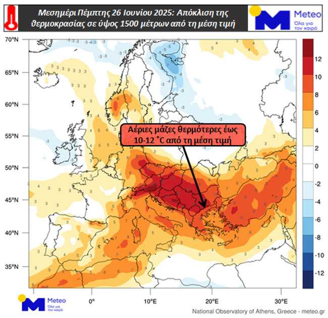 Επισυνάπτονται χάρτες με την απόκλιση της θερμοκρασίας σε ύψος 1.500 μέτρων από τη μέση τιμή της περιόδου 1979-2010 για το μεσημέρι της Πέμπτης (26/06), καθώς και με τη θερμική επιβάρυνση και σχετική επικινδυνότητα που αναμένεται σήμερα, Πέμπτη (26/06) και αύριο, Παρασκευή (27/06).