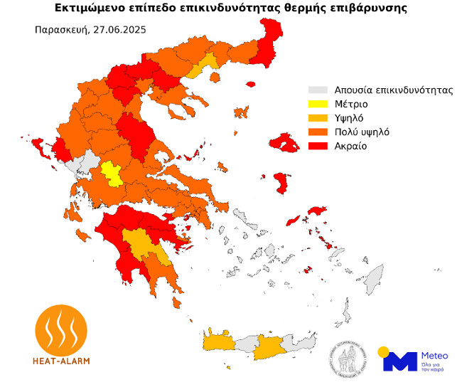 Την Παρασκευή (27/06) ακραία θερμική επιβάρυνση αναμένεται σε περιοχές της Μακεδονίας, Θράκης, Θεσσαλίας, Ηπείρου, Πελοποννήσου και νησιών Ανατολικού Αιγαίου, ενώ πολύ υψηλή θερμική επιβάρυνση αναμένεται στο μεγαλύτερο μέρος της χώρας.