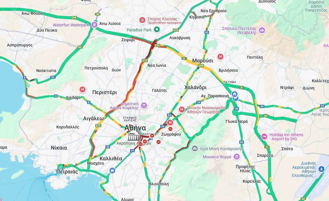 Προβλήματα υπάρχουν στην Αθηνών-Λαμίας εξαιτίας ακινητοποιημένων οχημάτων, τόσο στην άνοδο από τη λεωφόρο Αθηνών όσο και στο μεγαλύτερο μέρος της καθόδου, στη Μεσογείων, την Αλεξάνδρας και στα δύο ρεύματα, και στα δύο ρεύματα της Αμαλίας, της Βασιλίσσης Σοφίας από το ύψος της λεωφρος Αλεξάνδρας μέχρι και το Σύνταγμα, στη Συγγρού στο ρεύμα προς κέντρο, από το ΦΙΞ μέχρι και τη συμβολή με την Αμαλίας, στην Καλλιρόης, αλλά και στη Σταδίου. Καθυστερήσεις στη λεωφόρο Ποσειδώνος, στο ρεύμα προς Πειραιά, από το ύψος του Ελληνικού μέχρι τη συμβολή με τη λεωφόρο Αλίμου.