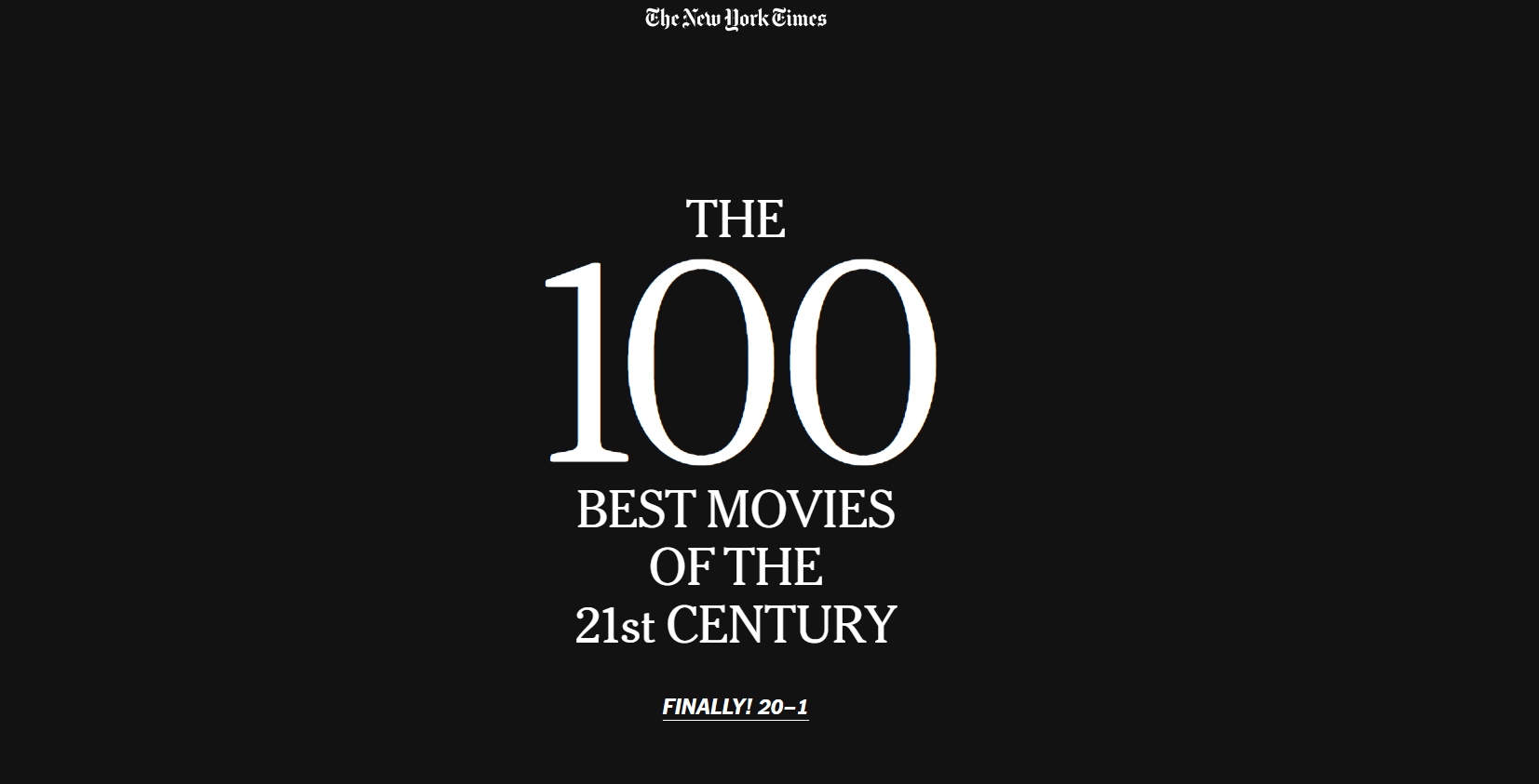 To ενδιαφέρον με τη λίστα των 100 καλύτερων ταινιών των πρώτων 25 χρόνων του 21ου αιώνα που επελέγησαν μετά από ψηφοφορία που διεξήγαγε η εφημερίδα Τimes της Νέας Υόρκης, είναι ότι η πίτα μοιράστηκε, μπορείς να πεις δίκαια, με την έννοια ότι η εκατοντάδα δεν μονοπωλείται από αμερικανικό κινηματογράφο αλλά υπάρχουν ταινίες από κάθε γωνιά του κόσμου.