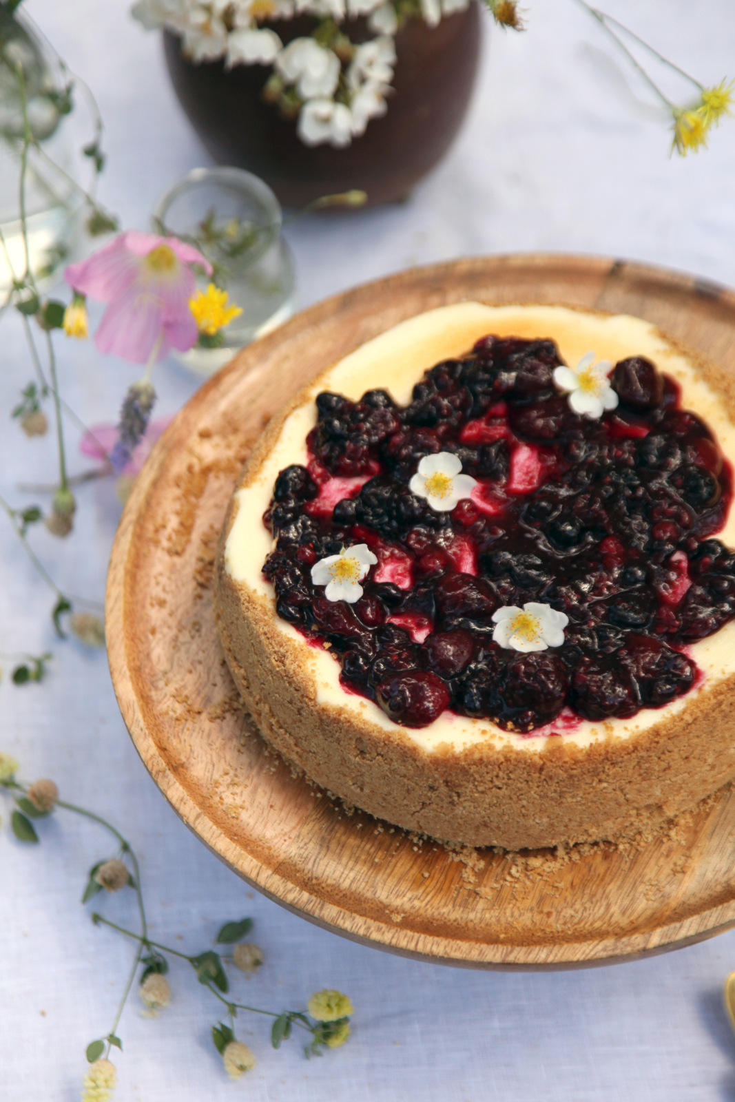 - Ρίχνουμε σε ένα κατσαρολάκι τα φρούτα του δάσους, το κορν φλάουρ και το χυμό λεμονιού και σιγοβράζουμε το μείγμα ανακατεύοντας διαρκώς για περίπου 10 λεπτά, μέχρι να πήξει ελαφρά. Αφήνουμε την κομπόστα να κρυώσει και στη συνέχεια την απλώνουμε στην επιφάνεια του τσιζκέικ και σερβίρουμε.